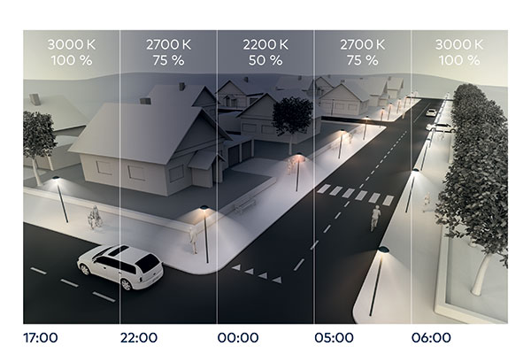 Um zu sehen, wie NightTune in der Praxis funktioniert, stellen Sie sich eine normale Nacht vor. Abends, wenn noch Fußgänger und Autofahrer unterwegs sind, bietet NightTune eine mäßige Farbtemperatur. Mitten in der Nacht, wenn die Straßen ruhig sind, wird die Lichtleistung der kühlen LEDs reduziert, so dass das Licht gedämpfter und wärmer wird. Mit der Morgendämmerung, wenn der Verkehr wieder zunimmt, steigt die Leistung der kühlen LEDs wieder an, um ein helleres und kühleres Licht zu erzeugen, das die höheren Sicherheitsanforderungen erfüllt.