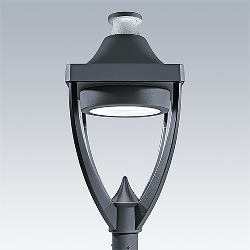 Lanterne LED patrimoine moderne Installation portée avec optique fermée. Electronique. Classe électrique II, IP65, IK08. Corps : aluminium Moulage sous pression thermopoudré gris 900, finition texturé (close to RAL 7043). Boîtier : verre trempé. Protection contre les surtensions : 10 kV en mode commun single pulse et 8 kV en mode commun multipulse; 6 kV en mode différentiel multipulse. Si un système DALI est connecté: 6 kV en mode mode commun et mode différentiel multipulse. Livré avec LED 3 000 K.