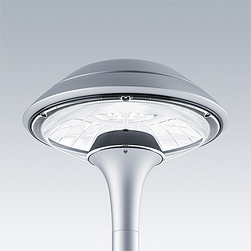 Plurio Direct : Lanterne LED décorative à montage top avec distribution Radialement symétrique. Driver avec 18 LED entraînés à 1,05A. Classe électrique II, IP66, IK08. Base : coulé aluminium, thermopoudré gris argent. Chapeau : forme plat, aluminium, texturé gris argent. Diffuseur : anti-UV, transparent Polycarbonate (PC) avec prismes anti-éblouissement. Optique à lentille direct avec réflecteur interne Equipé d'un 50% circuit de réduction de puissance, qui entre en vigueur 3 heures avant et 5 heures après un minuit calculé. Il peut être désactivé à l'installation avec un interrupteur interne facilement accessible. Livré avec LED 4 000 K. Montage top sur mât de Ø 60mm.