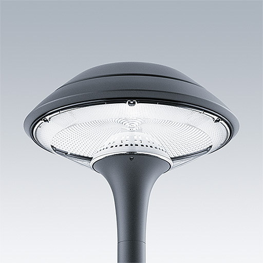 Plurio Indirect : Lanterne LED décorative à montage top avec distribution Radialement symétrique. Driver avec 24 LED entraînés à 250mA. Classe électrique II, IP66, IK08. Base : coulé aluminium, thermopoudré gris anthracite 900 sablé. Chapeau : forme plat, aluminium, texturé gris anthracite 900 sablé. Diffuseur : anti-UV, transparent Polycarbonate (PC) avec prismes anti-éblouissement. Optique à réflecteur indirect Equipé d'un 50% circuit de réduction de puissance, qui entre en vigueur 3 heures avant et 5 heures après un minuit calculé. Il peut être désactivé à l'installation avec un interrupteur interne facilement accessible. Livré avec LED 4 000 K. Montage top sur mât de Ø 60mm.