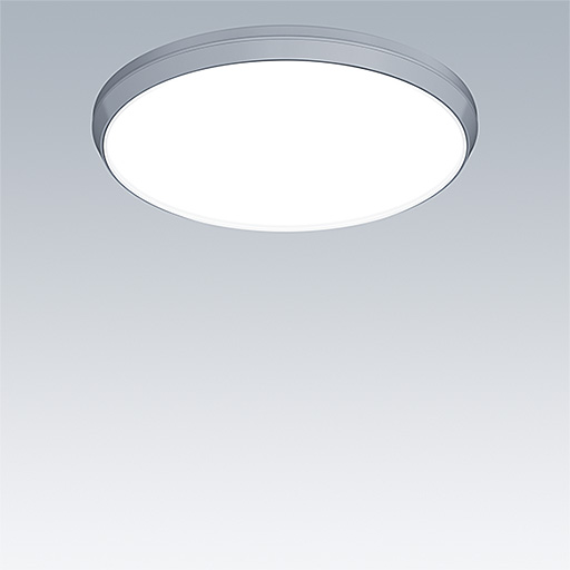 Luminaire circulaire décoratif avec corps Medium. Composant indirect bas pour éclairage du mur et du plafond. Électronique, gradable DALI. Garniture esthétique du luminaire en Polycarbonate (PC) argent. Diffuseur : opale Polycarbonate (PC). Classe électrique II, IP54. Livré avec LED 4 000 K.
