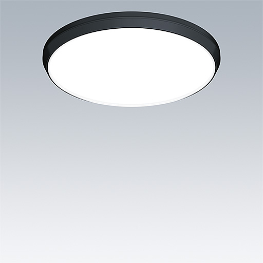 Luminaire circulaire décoratif avec corps Medium. Composant indirect bas pour éclairage du mur et du plafond. Électronique, gradable DALI. Garniture esthétique du luminaire en Polycarbonate (PC) noir. Diffuseur : opale Polycarbonate (PC). Classe électrique II, IP54. Livré avec LED 4 000 K.